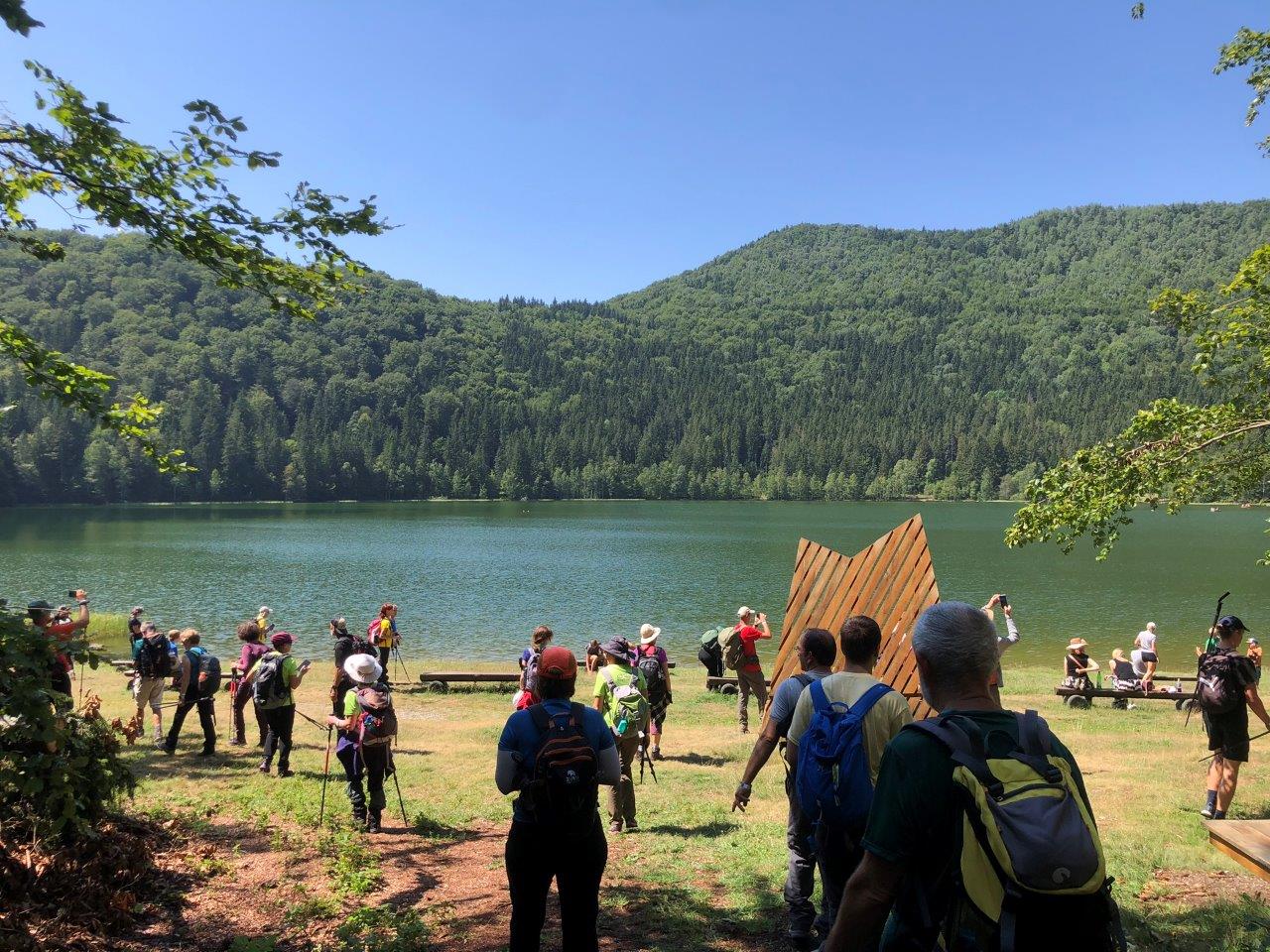 Annyira megijedtem a hidegtől, hogy a bundanadrág, téli zokni és polár felső mellett még dupla hálózsákkal is bebiztosítottam magam, így valamikor éjjel akkora hőhullám vonult végig rajtam, hogy minden takarót lerúgtam magamról. A reggel 6 órai ébredéskor sem volt sokkal hidegebb, de azért biztonságból magamra vettem a bélelt túradzsekimet, s a kedvezőtlen időjárás-előrejelzés miatt az esőkabát sem maradt ki a hátizsákból. (Mint utólag kiderült, mindkettőt teljesen feleslegesen cipeltem magammal, mert a beígért eső elmaradt, helyette pedig igazi nyári melegben túráztunk.) A tábor bejárata előtt már gyülekezett a csapat, s mivel teljesen elvarázsolt a reggeli fényben fürdőző párafelhők látványa, csak néhány perc után döbbentem rá, hogy az a rengeteg ember mind a 7-es túrára iratkozott be, amelyikre mi is. Kocsis György (Gyuri), a fő túravezető-segéd, türelmesen olvasta fel a kb. 155 résztvevő nevét, így 10 percbe is beletelt, míg a lista végére ért. Ezután pedig elindult a sáskaraj, hiszen így lehetne a legszemléletesebben jellemezni népes csapatunkat, s a Csukás-tó melletti parkolóig meg sem álltunk, ahol mind az öt túravezető bemutatkozott, Gyuri elmondott néhány fontos szabályt, Rozi, a fő túravezetőnk pedig röviden mesélt a Csomád-hegységről, s túránk útvonaláról. Aztán indultunk tovább, a véget nem érő sor nagy nehezen átkelt az átjárón, az Apor- és Mikes-forrásokat elhagyva pedig hamarosan beértünk az erdőbe. Mivel aránylag a sor elejére kerültünk, innentől kezdve az első hosszabb pihenőig egyszer sem sikerült megpillantanunk a sor végén kullogó túratársakat. Az Urak ösvényének meredek szerpentinjein kígyózott felfele az embertömeg, mígnem a Kis-Csomád és a Nagy-Csomád között elértük a Szöktető-pusztát, ahol hosszabb szünetet tartottunk. Innen a Nagy-Csomád oldalában haladtunk tovább, a csúcsra viszont nem mentünk fel, mert túravezetőink szerint semmilyen kilátás nem fogadott volna. Látszólag ez senkit sem zavart, egy vidám hölgytársaság pedig még dalolni is kezdett, eleinte az Újra itt van a nagy csapatot fújták, utána pedig a Pál, Kata, Péter következett, amelyet kánonban is megkíséreltek. Szép fokozatosan ereszkedve hamarosan kiértünk a Tó bércére, ahol a menedékház is található. A tűző napsugaraknak köszönhetően előkerültek a kalapok és a napkrémes tubusok is, majd elindultunk a Szent Anna-tó irányába. Mivel a kényelmes, turistáknak kiépített ösvényt eltorlaszolták a viharban kidőlt fák, a kígyózó aszfaltúton kellett leereszkednünk a tóhoz, amely Közép-Kelet-Európa egyetlen épen maradt vulkáni kráterének alján képződött nagyjából 32 ezer évvel ezelőtt. Középiskolás koromban jártam először (s azt hittem, utoljára) a Szent Anna-tónál, akkor még lehetett fürödni is benne, az utóbbi évtizedekben viszont egyre jobban veszélybe került az élővilága és vízminősége, s elindult egy algásodási folyamat is, így 2018 óta csakis csónakázni lehet rajta. Rozitól azt is megtudtuk, hogy valószínűleg szándékos betelepítés következtében megjelent és elszaporodott az ezüstkárász, felborítva az ökológiai egyensúlyt, amely szintén hozzájárult az algásodáshoz. Természetesen a népszerű székely monda is elhangzott a tó kialakulását illetően, így mindenki vidáman heveredett le a parton, gyönyörködve a természet alkotta különleges csodában. Az egyórás szünet alatt uzsonnázásra és pihenésre is bőven jutott idő, sőt, a közeli Szent Anna-kápolnát is meg lehetett tekinteni kívülről, majd a már ismert aszfaltúton indultunk vissza. A szembejövő emberek meghökkenten tekintettek népes csapatunkra, biztosan ijesztő látvány lehettünk. Amikor visszaértünk a menedékházhoz, kiderült, hogy a korábban ígért, szakember által vezetett séta elmarad, ráadásul egy előre bejelentkezett másik csapat érkezése miatt sietve kellett áthaladnunk a Mohos-tőzegláp szigorúan védett területén, így mind a 150 ember felhúzta a nyúlcipőjét. A sietős tempó ellenére is igazán különleges élményt jelentett végigsétálni a fapallón, hiszen egy teljesen egyedi ökoszisztémát csodálhattunk meg, és két kis tószem mellett is elhaladtunk. Mint utólag megtudtuk a túravezetőnktől, a tőzeg helyenként akár 10 m vastag is lehet, az alig pár méter átmérőjű sötét vizű tószemek pedig a 20 m mélységet is elérhetik. Érdekességként elmondta, hogy a pallókat a medvék nyomvonalát követve építették, mivel így tudták, hogy az adott helyen elég vastag a tőzeg. Innentől kezdve következett a fokozatos ereszkedés Lázárfalva irányába, eleinte köves úton, majd tágas mezőkön és búzaföldeken keresztül, sőt még két patakocskán is át kellett kelnünk. Mielőtt beértünk volna a faluba, a csapat egy kisebb része kitérőt tett a Borvíz-tető alatt található Nyír-fürdőhöz, ahová a helyiek és környékbeliek gyógyulni járnak az ott található mofetta (száraz gázkiömlés), borvízmedence és két kéntejes lábáztatójának köszönhetően. Mi a csapat nagyobb részével elsétáltunk a CsEKE házához, ahol a buszok érkezéséig kinyújtóztathattuk fáradt izmainkat, hiszen a 19 km-es túra során közel 790 m teljes szintemelkedést tettünk meg.