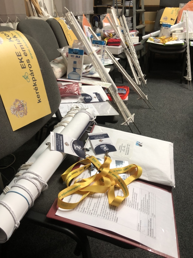 Lassan-lassan kezdett visszatérni a reményem, hogy mégis sikerül mindent megoldani, s már a fényt is láttam az alagút végén, hiszen az irodai teendőkkel is az elvártnál sokkal jobban haladtam. Csütörtök délután nekiláttunk az indítócsomagok összeállításának Ingriddel, Nagy Julikával és Benczédi Ágnessel, közben Kardos Tibi is bekapcsolódott, s több feladatot is bevállalt. Nagyjából hét órára meg is lettünk mindennel, már „csak” a pontbírók csomagjainak összeállítása és az autóba való bepakolás maradt hátra, hiszen Julival úgy egyeztünk, hogy Pali másnap délben tudja kivinni a járművet Sztánára. Közben eszembe jutott, hogy a hosszú gyalogos és kerékpáros térképekbe elfelejtettem kinyomtatni a leírásokat, így utólag egyenként be kellett rakosgatnom őket mindegyik csomagba, s a kerékpáros rajtszámok is kimaradtak néhány zacskóból, így azokat is pótoltam, egy póló pedig nem stimmelt a nyilvántartásommal, így néhány csomagot át kellett néznem, hogy hova kerülhetett be egy női modell a férfi helyett… Aztán az egyik sátortokban találtam egy csavart, aminek nem ott lett volna a helye, így minden javított sátrat át kellett vizsgálnom, hogy megvannak-e a csavarjaik. Közben lecipeltem mindent az EMT-székházba, amire szükségem volt a pakoláshoz, s nekiláttam az egyik leghálátlanabb feladatnak, a pontbírócsomagok összeállításának, ami minden alkalommal egy többórás kálváriát jelent. Adott pillanatban akkora káosz volt a teremben, hogy a sírást is elkezdtem, aztán betettem egy playlistet a telefonomon és próbáltam csakis a feladatra koncentrálni. Ahányszor hiányzott még valami, felszaladtam az irodába, közben az energiapótlókat is szétosztottam, kicsit átrendeztem a kisteherautót, s szép lassan, szemerkélő esőben elkezdtem áthordani a vizeket, sátrakat, asztalokat, indítócsomagokat, pontbírókellékeket. Ahogy ürülni kezdett a terem, az idegeim egyre jobban lenyugodtak, s már nem is zavart, hogy a pakolás belenyúlt az éjszakába. Amire mindennel végeztem, már fél négyet ütött az óra, s a derekam is rendesen beállt, de legalább teljesíteni tudtam a tervemet, hogy péntek délre kész legyen az autó, így nyugodt lelkiismerettel hajtottam álomra a fejem.