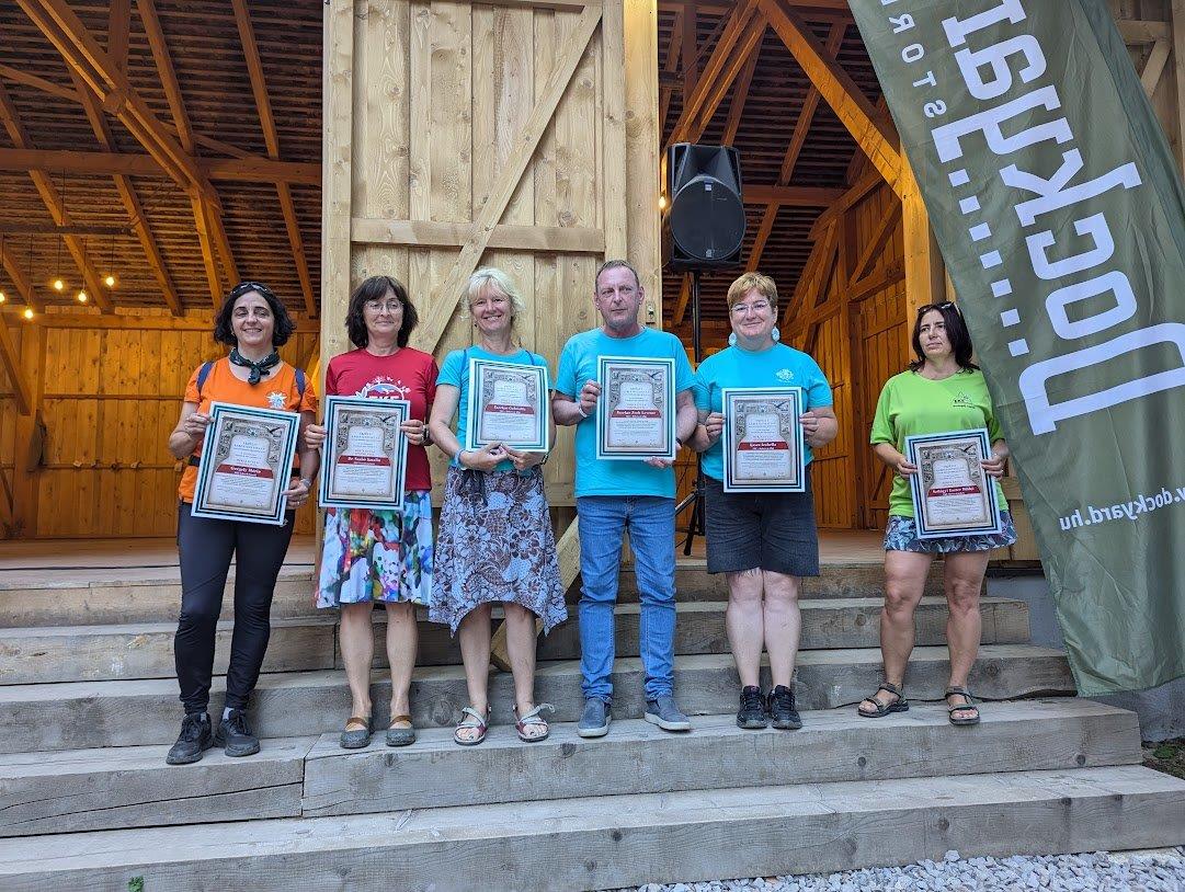 Az ünnepségen a megszokott rend szerint Szabó Károly táborparancsnok ismertette az idei tábor eredményeit, és néhány érdekes statisztikai adatot, majd átnyújtotta a legfiatalabb és legtapasztaltabb túratársnak járó oklevelet, de a legnépesebb családot is kiszólították. Ezután a különböző vetélkedők nyerteseit díjazták, majd következett a 10, 15, 20, 25 és 30 vándortábori részvételért járó jubileumi jelvények átadása. Nagy büszkeségünkre szolgált, hogy a 30 részvételért járó kitüntetést Nyisztor Miklós mellett Kovács Zsuzsa, egyesületünk elnöke vehette át. Végezetül a különböző tagosztályok oklevelekkel ismerték el azoknak az EKE-tagoknak az önzetlen munkáját, akik az elmúlt évben tevékenységükkel jelentősen hozzájárultak az egyesület működéséhez és fejlődéséhez. A kolozsvári EKE részéről Merza Gyula-díjat vehetett át Fazekas Gabriella, Fazekas Zsolt, Kasza Izabella és Sebe Klára Csilla odaadó szervezői tevékenysége, valamint a teljesítménytúrák során nyújtott nélkülözhetetlen segítsége elismeréseként, Pál Gyöngyi pedig Balogh Ernő-díjban részesült a természetjárás területén végzett rendszeres és kiemelkedő túravezetői tevékenységének elismeréseként. Az ünnepség záróakkordjaként bejelentették a 2026-os EKE Vándortábort, amelyet augusztus 4–9. között fognak megszervezni Gyergyócsomafalván, majd harangszó kíséretében Tőke Dénes, a Csíkszéki EKE korelnöke levonta a tábori zászlót. Ezután a tömeg oszlani kezdett, mi pedig gyorsan átsiettünk a kolozsvári csapat által birtokba vett panzióba, hiszen meglepetéssel készültünk Ingrid számára, aki épp a következő napon ünnepelte a születésnapját. A küldöttgyűlés ideje alatt Zsófi elkészítette a meglepetéstiramisu-tortát, amelyet Halász Judit születésnapi dalának kíséretében nyújtottunk át az ünnepeltnek. Ingrid annyira meglepődött, hogy szóhoz sem jutott, majd serényen felszeletelte az ízletes édességet, hogy mindenkinek jusson belőle. Ennél méltóbb befejezése nem is lehetett volna az élménydús hetünknek, amelyet hajnalig tartó retro bulival koronáztunk meg.