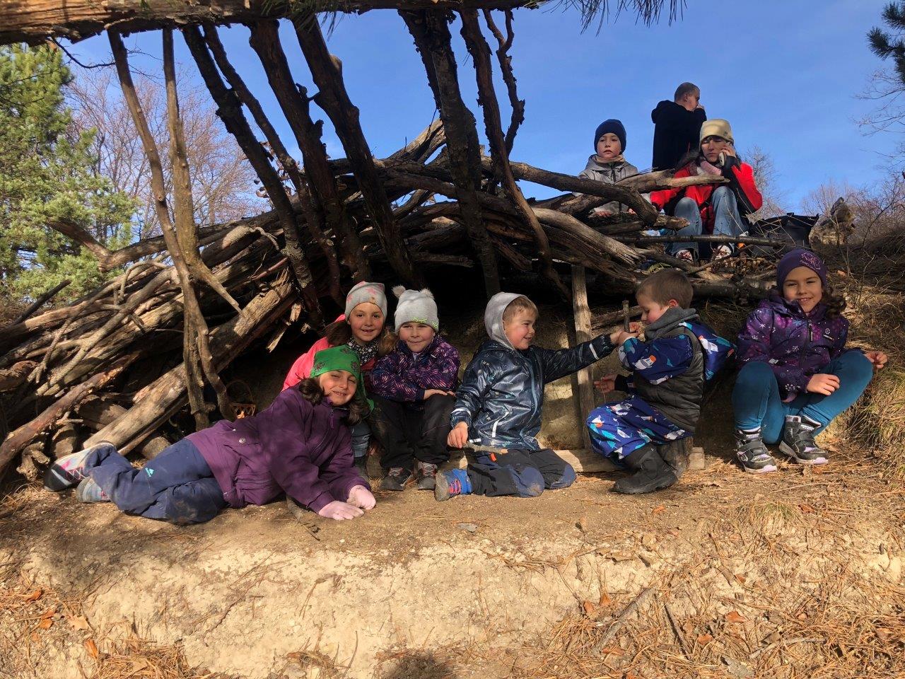 Ezután következett kirándulásunk fénypontja: az erdő fái közül előkerült a Mikulás piros puttonya, amelyben édesség, gyümölcs és egy kis síp rejtőzött minden gyermek számára. Pár pillanaton belül már vidám sípszó töltötte be az egész kilátót, így a völgyben lakó emberek is biztosan hallották, hogy gyerektúrát szervezett az EKE. A játékkal annyira elrepült az idő, hogy a tűz már vígan égett, így a szülők nekiláttak a sütögetésnek, amelybe a gyerekek is örömmel bekapcsolódtak. Hamarosan sült szalonna, kolbász és a hagyma finom illata töltötte be a levegőt, így mindenki jóízűen megebédelt az otthonról hozott finomságokból. Néhány családnak korábban el kellett indulnia hazafelé, így amire eszünkbe jutott a csoportkép elkészítése, már megfogyatkozott 43 fős csapatunk. Ezután mi is gyorsan összepakoltunk, és szaporán visszaindultunk az autókhoz, hiszen délutánra több mindenkinek be volt tervezve egy-egy családi program. Lefele már sokkal könnyebben haladtunk, így a gyerekek gyorsan elfogadták, hogy nem lesz több pihenő, s egy óra 15 perc alatt vissza is értünk a völgyben található autókhoz. A viszontlátás reményében mondtunk búcsút egymásnak, majd mosolyogva indultunk haza az év utolsó gyerektúrájának vidám emlékeivel.