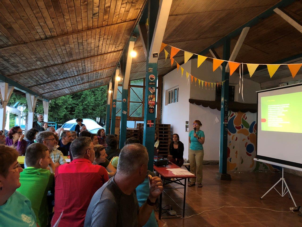 A sátortáborban megkerestem a kolozsvári csapatot, akik néhány anyaországival is osztoztak a számukra kijelölt területen, hiszen a társaság egy része a közeli panzióban szállt meg, így nem tartottak igényt a sátorhelyre. Kasza Iza a megszokott nagy ölelésével üdvözölt, s elmesélte, hogy miért alakult ki a 3-4 órás sor, majd Kovács Zsuzsa is kikukucskált a sátorból. Közben megérkeztek Filep Ingridék is, akik nem sokkal később indultak, mint mi, így végig tartottuk a kapcsolatot, hogy ki hol jár. Lukival és Ágival is összefutottunk, akik két éve iratkoztak be a kolozsvári EKE-be, s azóta nemcsak a táborokban, hanem a túráinkon is rendszeresen részt vesznek. Felajánlottam, hogy segítek nekik felhúzni a nagy sátrukat, de közben megpillantottam, hogy Tamás Emese egyedül próbál kiigazodni a sátorállítás művészetében, így inkább hozzá siettem. A sikeres művelet után elsétáltunk a csűrhöz, ahol már megkezdődött a nyitóünnepség, a rengeteg inger és az ismerős arcok kavalkádjában viszont nehéz volt a felszólalókra fókuszálnom. Annyira emlékszem, hogy a polgármester elsütött néhány poént a medvetéma kapcsán, majd mindenkit megnyugtatott, hogy nem kell aggódnunk, mert az elmúlt években jelentősen visszaszorult a támadások száma... A Kardos családdal (Zsuzsa, Tibi, Zalán és Csenge) találkozva megtudtam, hogy előző héten épp Tusnádfürdőn vettek részt egy táborban, így alig értek haza Kolozsvárra, fordulhattak is vissza, közben pedig Nagy Évának és Ferenczi Julinak is odaköszöntem. Legnagyobb örömömre összefutottam Nádudvary Györgyivel is, akit a tavalyi táborban ismertem meg, s számomra ő jelentette az akkori hetem egyik színfoltját. Magas, szakállas, kalapot és szemüveget viselő, jellegzetes fizimiskájú holland férjét már messziről kiszúrtam a tömegben, így biztos út vezetett hozzá. Közben Botond talált egy tuti helyet a hajlékunkként szolgáló méretes járműnek a váradi EKE-sek mellett, így Lázár Tibivel és Brădescu Gerharddal is sikerült összefutnunk. Lefekvés előtt még átnéztünk a kemping mellett lévő panzióba, ahol a kolozsvári csapat egy része megszállt, közben pedig az eső is megeredt, így 10 óra körül tudtunk visszamenni a táborba, s eltenni magunkat másnapra.