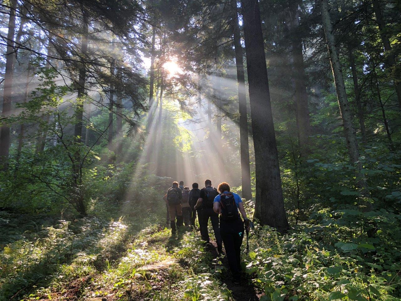 A közeledő égiháború nyomására egyre gyorsabb léptekkel követtük a Fehér-kő (Albele) szelíd hegygerincét, néhány túratársunk pedig óriáskalapú őzlábgombákra lett figyelmes, így bevállaltak még néhány méter szintet pluszban, hogy megszerezzék a trófeát. Az Esztena-nyeregbe érve egy utolsó felszusszanásnyi pihenőt tartottunk, majd elindultunk a szűk szárazvölgyön lefele, óvatosan lépkedve a csúszós, bokatörős köveken. Mint megtudtuk, Dénes bácsi, a Csíkszéki EKE 80 év feletti túravezetője úgy állította össze az útvonalat, hogy mindenképp kijöjjön a 24 km. Már-már beletörődtünk, hogy ezután következik csak az igazi tortúra, hiszen a további 11 km-t nem feltétlenül a látványért, hanem sokkal inkább a teljesítményért kell megtennünk. Amikor a morálunk már vészesen csökkenni kezdett, szerencsére még tartogatott számunkra egy meglepetést az útvonal, hiszen észrevétlenül az Esztena völgysziklaszorosában találtuk magunkat robosztus sziklafalak között. Helyenként a sziklafalak olyan közel kerültek egymáshoz, hogy csak egy személy tudott elhaladni közöttük, így a látvány minden nehézséget elfeledtetett. A völgy nemsokára kiszélesedett, amikor pedig kiértünk az erdő fáinak védelméből, az eső is rázendített, de amilyen gyorsan jött, olyan gyorsan tovább is vonult. Az Esztena tisztásra kiérve kevésbé járt túraösvényen haladtunk tovább, a málnabokrok csábításának engedve pedig többször is meg-megálltunk. Kellett is a spiritusz, hiszen a következő 4 km-en még ki kellett másznunk 230 m szintet, amelyet mindenki a háta közepére kívánt. Nagy nehezen elértük azt a kereszteződést, ahol reggel a túravezetőnk jelezte, hogy ott fogunk majd visszatérni bezárva a kört, a beígért pihenő viszont elmaradt, hiszen mindenki igyekezett vissza a buszhoz. Az utolsó 2,5 km ereszkedést enyhén sajgó lábakkal tettük meg a sor végén kullogva, de szerencsére Veres Ági nyerte meg a fogadást, hiszen 6 óra előtt visszaértünk a buszhoz, így még a megrendelt napi menüt sem késtük le a táborban. Végül az eredetileg meghirdetett 26 km-es táv helyett „csak” 24 km-t tettünk meg 1300 m teljes szintemelkedéssel.