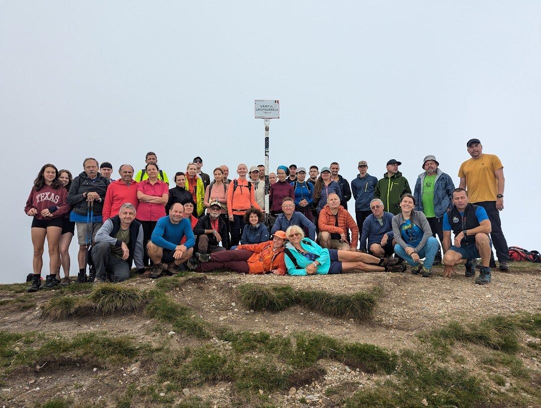 A köd könyörtelenül kezdte bekebelezni a magunk mögött hagyott utat, rövid időn belül pedig elértük a Gropșoarele 1883 m-es csúcsát, túránk legmagasabb pontját, ahol egy hosszabb pihenőt tartottunk. Hirtelen annyira hűvösnek tűnt a levegő, hogy mindenkinél előkerültek a felsők (már aki hozott magával), az uzsonna elfogyasztása után pedig elkészült a csoportkép is, így indulhattunk tovább. Hirtelen belénk hasított a felismerés, hogy a csúcsig mindössze 6,4 km-t tettünk meg a 24-ből, s azt is több mint 4 óra alatt, így kicsit aggódni kezdtünk, hogy visszaérünk-e időben a táborba. A gerincen tovább haladva megpillantottuk a vöröshegyi menedékházat, később pedig a Csukás-menedékház sziluettje is kirajzolódott a ködben. Kardos Tibi szavaival élve druzsbaszonáta és tejfehér köd kísért utunkon, a Gropșoarele-nyeregbe leérve pedig találkoztunk egy népes juhnyájjal, amelyet csupán a pásztor őrzött, kutya egy szál sem. Botond vészjóslóan megszólalt, hogy amennyiben nem javítunk a tempónkon, csak este 8-ra érünk vissza a buszhoz, Veres Ági viszont nem akart hinni a fülének, így fogadott egy fagyiban, hogy 7 előtt már a busznál leszünk.
