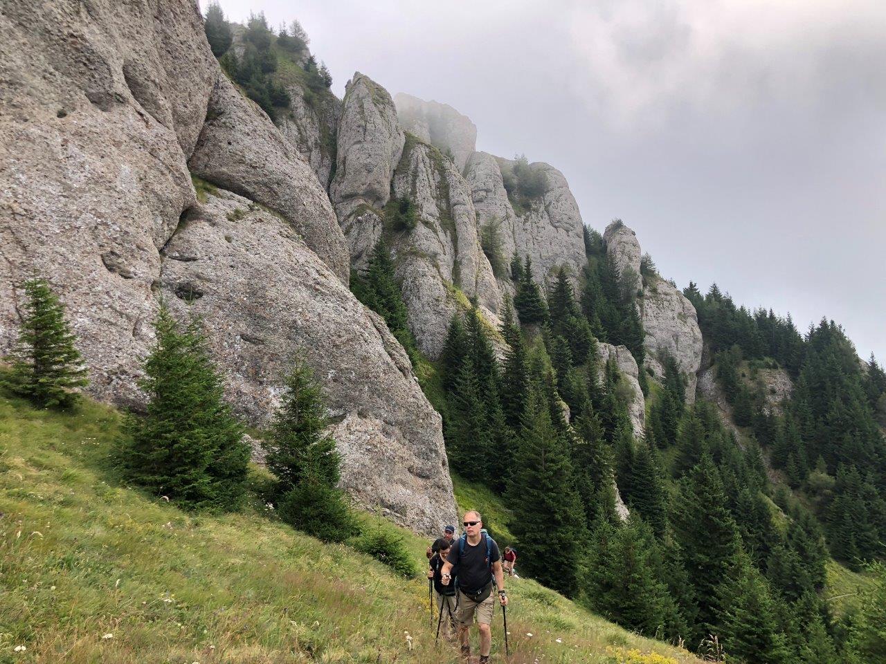 A nap hétágra sütött, így a napkrémek és a kalapok is előkerültek, ám amint megkezdtük a meredekebb emelkedést, már el is bújt a felhők mögé, kellemesebbé téve az amúgy sem könnyű menetelést. Egyik túratársunk nagyon nehezen bírta a tempót, így kicsit aggódtunk, hogy hátráltatni fogja a csapatot, amint viszont kiértünk a Zákány-gerincre, egyik ismerőse megnyugtatott, hogy az úr gond nélkül legyalogolta az El Camino (Szent Jakab-út) 800 km-es távját, úgyhogy nem lesz probléma. A gerincen különleges látvány fogadott: a hegy egyik oldala ködfelhőben úszott, míg a Cheia felőli völgyet szinte tökéletesen láttuk, a magas páratartalom miatt viszont a távolabbi hegyek nem mutatták meg magunkat. Tovább indulva elhaladtunk egy magas sziklafal mellett, érintettünk két kilátópontot, majd észrevétlenül a Csukás különleges sziklaalakzatainak birodalmában találtuk magunkat, ahol nem győztünk betelni a csodás látvánnyal. Az egyik túratársunk vidáman felkiáltott, amikor észrevett egy havasi gyopárt, néhányan pedig hasonló izgatottsággal fényképeztük le az EKE szimbólumát, amelyet most láttunk először természetes környezetében. A Zákány-csúcs (Zăganu, 1814 m) hivatalosan nem volt benne a túraútvonalban, így csak néhányan mászták meg, én viszont inkább kihagytam a meredek emelkedőt tériszonyomra hivatkozva. Nemsokára következett a sodronyos rész, amelytől nagyon tartottam, de szerencsére gyorsan túljutottunk rajta, így magabiztosan meneteltünk tovább, élvezve a titokzatos ködtengerben úszó hegyormok látványát. Ezután következett még egy meredekebb, csúszósabb sziklás rész, ahol minden lépésre figyelnünk kellett, majd lassan megérkeztünk a borókák birodalmába, ahol a szemfülesek még áfonyát is találtak.