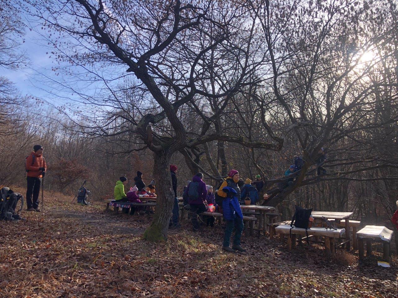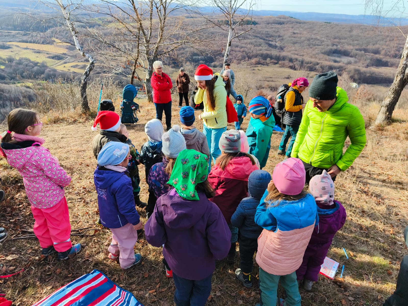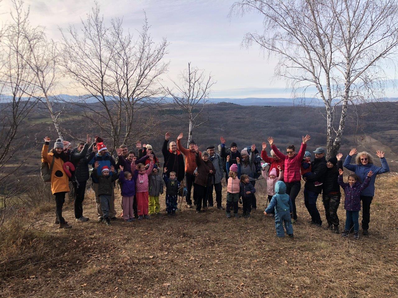 Ezután következett kirándulásunk fénypontja: az erdő fái közül előkerült a Mikulás piros puttonya, amelyben édesség, gyümölcs és egy kis síp rejtőzött minden gyermek számára. Pár pillanaton belül már vidám sípszó töltötte be az egész kilátót, így a völgyben lakó emberek is biztosan hallották, hogy gyerektúrát szervezett az EKE. A játékkal annyira elrepült az idő, hogy a tűz már vígan égett, így a szülők nekiláttak a sütögetésnek, amelybe a gyerekek is örömmel bekapcsolódtak. Hamarosan sült szalonna, kolbász és a hagyma finom illata töltötte be a levegőt, így mindenki jóízűen megebédelt az otthonról hozott finomságokból. Néhány családnak korábban el kellett indulnia hazafelé, így amire eszünkbe jutott a csoportkép elkészítése, már megfogyatkozott 43 fős csapatunk. Ezután mi is gyorsan összepakoltunk, és szaporán visszaindultunk az autókhoz, hiszen délutánra több mindenkinek be volt tervezve egy-egy családi program. Lefele már sokkal könnyebben haladtunk, így a gyerekek gyorsan elfogadták, hogy nem lesz több pihenő, s egy óra 15 perc alatt vissza is értünk a völgyben található autókhoz. A viszontlátás reményében mondtunk búcsút egymásnak, majd mosolyogva indultunk haza az év utolsó gyerektúrájának vidám emlékeivel.