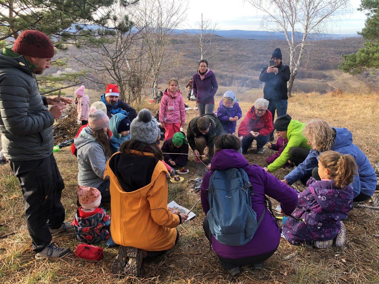 Ezután következett kirándulásunk fénypontja: az erdő fái közül előkerült a Mikulás piros puttonya, amelyben édesség, gyümölcs és egy kis síp rejtőzött minden gyermek számára. Pár pillanaton belül már vidám sípszó töltötte be az egész kilátót, így a völgyben lakó emberek is biztosan hallották, hogy gyerektúrát szervezett az EKE. A játékkal annyira elrepült az idő, hogy a tűz már vígan égett, így a szülők nekiláttak a sütögetésnek, amelybe a gyerekek is örömmel bekapcsolódtak. Hamarosan sült szalonna, kolbász és a hagyma finom illata töltötte be a levegőt, így mindenki jóízűen megebédelt az otthonról hozott finomságokból. Néhány családnak korábban el kellett indulnia hazafelé, így amire eszünkbe jutott a csoportkép elkészítése, már megfogyatkozott 43 fős csapatunk. Ezután mi is gyorsan összepakoltunk, és szaporán visszaindultunk az autókhoz, hiszen délutánra több mindenkinek be volt tervezve egy-egy családi program. Lefele már sokkal könnyebben haladtunk, így a gyerekek gyorsan elfogadták, hogy nem lesz több pihenő, s egy óra 15 perc alatt vissza is értünk a völgyben található autókhoz. A viszontlátás reményében mondtunk búcsút egymásnak, majd mosolyogva indultunk haza az év utolsó gyerektúrájának vidám emlékeivel.