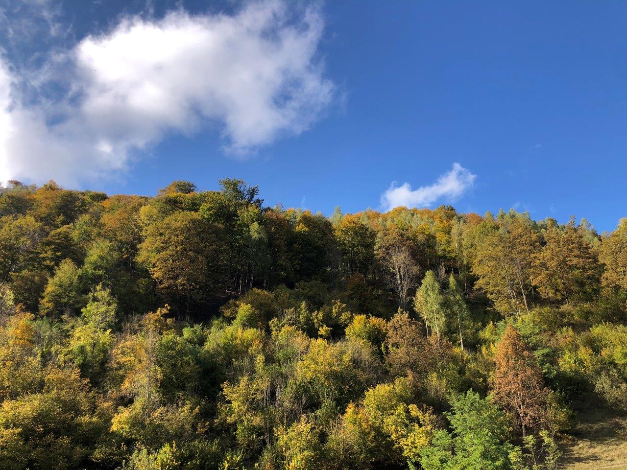 Lent a csapat egy része pihenőt tartott, a többiek viszont bevállaltak egy utolsó mászást az Urdorii-csúcsra (976 m), ahol a korábban elhaladó őzek nyomaira is figyelmesek lettünk. A Bélavára ez alkalommal felhőbe burkolózott, így csak részben mutatta meg magát, viszont a tető pereméhez közeledve újabb pazar kilátásban lehetett részünk: az Aklos-patak völgye és a Ronki-szoros meredek sziklafalai mellett a távolban a Tordai-hasadék és Léta vára is feltűnt, de a Torockói-hegység magaslatai is egyre tisztábban látszódtak. A nyeregbe visszaérve együtt indultunk tovább a fehér törzsű, karcsú nyírfák között, néhol pirosan rikító légyölő galócákat is találtunk. A hosszú ereszkedést a lemenő nap fényében fürdőző lombhullatók színkavalkádja tette különlegessé, a Ronki-szorosba érve pedig további 3 km-es kellemes séta várt ránk, amely során gyönyörködhettünk a robosztus, meredek sziklafalakban. Autóinkhoz visszaérve kellemes meglepetés fogadott: a helyi tejcsarnok és kisüzlet tulajdonosainál még maradt néhány darab a frissen sült kenyérből, így jóízűen falatoztunk belőle, miközben elraktároztuk magunkban a túra során megtapasztalt csodákat.