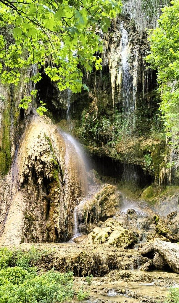 Elsőként a termálvízeséshez mentünk, ami néhány perces sétával elérhető a fürdőtelep központjából. A vízesést (románul Cascada Clocota) termálforrás táplálja, ami télen sem fagy be. A 15 m magasból alázúduló, csillogó víztömeg csodálatos látvány, a belőle kicsapódó ásványi anyagok pedig cseppkőszerűen rakódnak le a sziklára, növényzetre. Rabul ejtett minket is a látvány, akárcsak Kazinczy Ferencet kétszáz évvel ezelőtt. Az Erdélyi levelekben ekképpen ír az algyógyi vízesésről: „Első szabad esése, a tető mogyorói közül, egy pár ölnyi. De itt nagy csúcs kél elébe, s felkapja a patak esését, s úgy szalad ezer apró mozdulásokban, millió meg millió csillám közt alá a mélységbe, mint eleven ezüstlepel… A víz mészrészeket rak le, s ezek sokára ott is követ termesztenek, ahol az nem volt, viszont azt is teszi, hogy ne legyen, ahol volt.” Kazinczy 1816-ban három hónapon keresztül bejárta Erdélyt, főleg azzal a céllal, hogy meglátogassa itteni barátait és levelezőtársait, rokonait. Erdélyi utazásának emlékét őrzi számos kiadásban megjelent munkája, az Erdélyi levelek. Amikor 2016-ban mi is elindultunk bejárni Kazinczy erdélyi útját, hogy minél pontosabban tudjuk követni, elolvastam a könyvet. Ekkor szereztem tudomást az algyógyi vízesésről, amit azóta már többször felkerestünk.