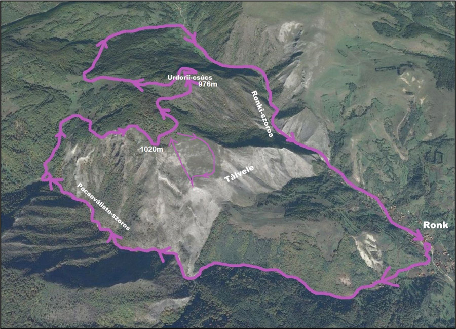 Visszajövünk a csúcson hagyott hátizsákjainkért, majd nyugati irányban leereszkedünk a csúcsról. Egy lapos nyergen átkelve egy kissé oldalazva elérjük aztán azt a nyerget, amely lényegében elválasztja a két szorost. Innen egy elég hosszú ereszkedő kezdődik, végig egy szekérúton haladva elérjük az Aklos-patak völgyét Lunkalárga falu első házainál, ahol jobbra fordulva a patak folyása mentén lefelé haladva rövidesen a Ronki-szorosban találjuk magunkat. A kristályos mészkőbe vájt szorosban csupán egy hosszabb barlang van 378 m járattal. A szoros közepe táján van egy igen bővizű forrás. A szorosnak mintegy 20 hektáros környezete természetvédelmi terület (ugyanaz a törvény, mint a Pocsováliste-szoros esetében).